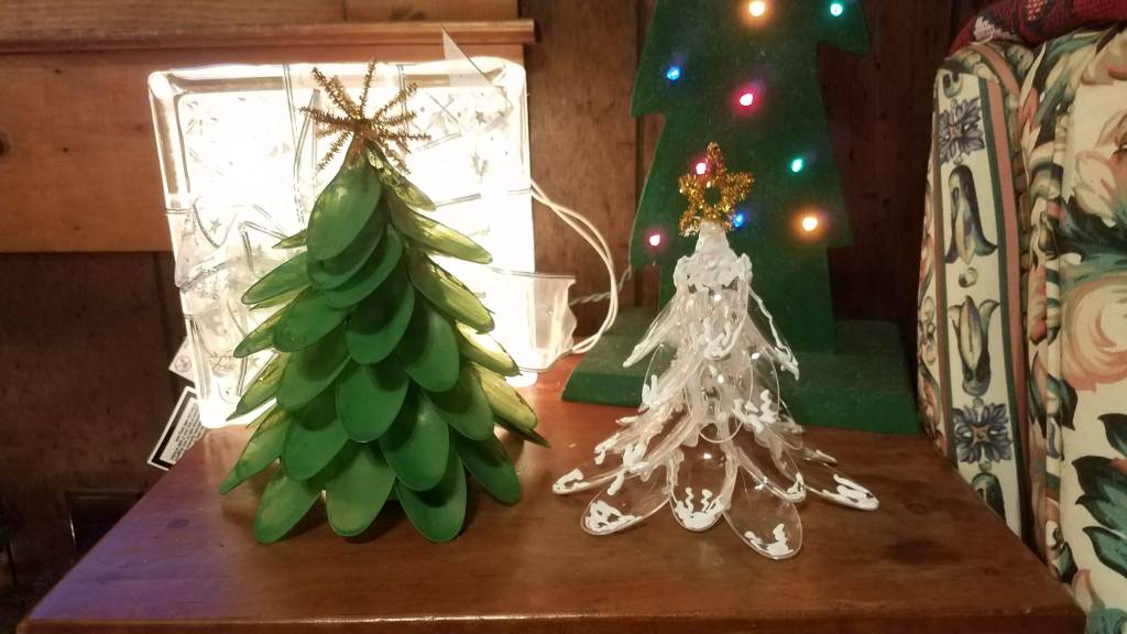 The Model: Very classy, elegantly painted Christmas trees made of cut-up plastic spoons.
