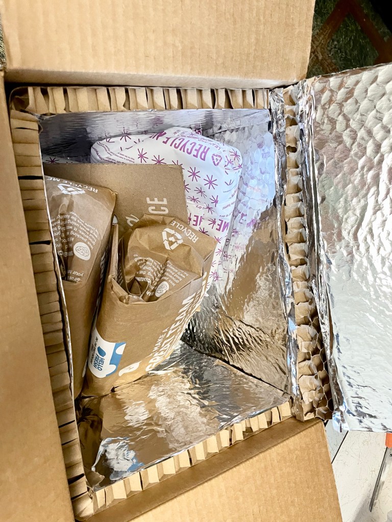 As shown above, the box itself is actually insulated to keep the food cool and it comes with these ice packs that you can reuse or recycle based on the instructions on the packaging. Each meal comes in its own brown paper bag with the meat in a separate airtight container so it can be frozen until you’re ready to cook.