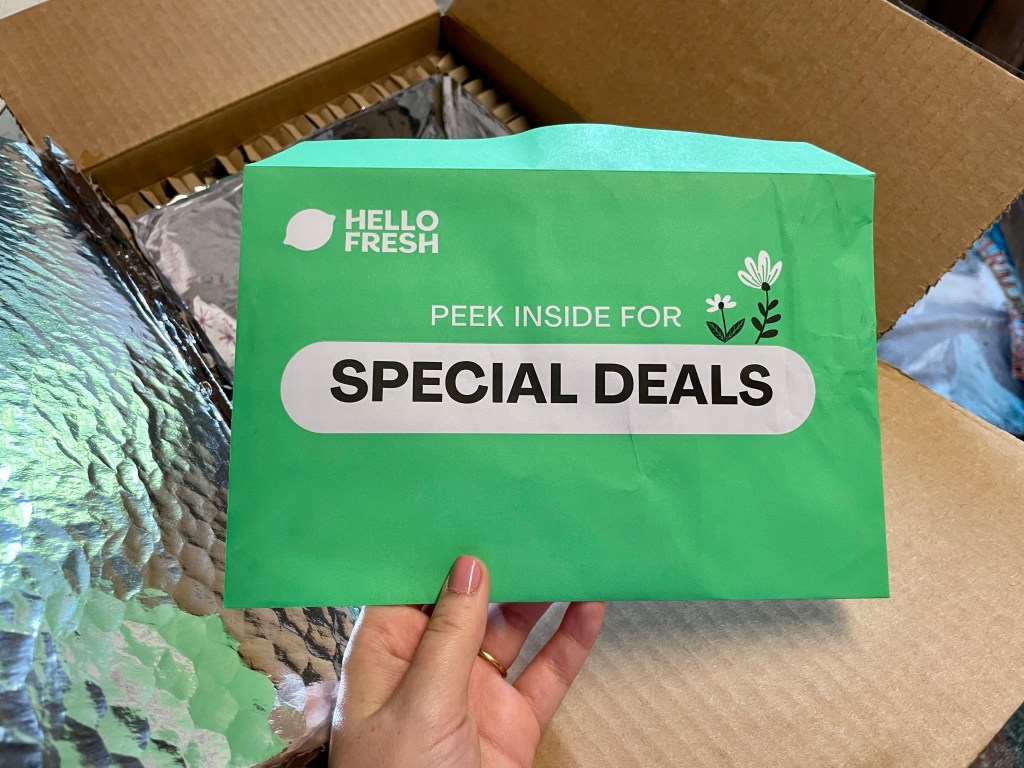 Upon opening the box, you find the recipes and lists of ingredients included, as well as some little extras HelloFresh decided to throw in. Usually they come in a little green envelope like the one below.